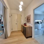 L’ingresso si apre su un soggiorno luminoso, collegato direttamente all’esterno, mentre la cucina resta separata e funzionale. La zona notte offre due camere con parquet e due bagni entrambi con doccia e uno dei quali in camera.
